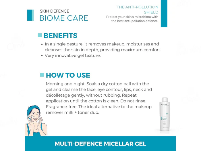 Ainhoa Biome Care Multi-Defence Micellar Gel is a unique micellar-based facial cleanser formulated with probiotics and protective actives that reinforce the skin’s microbiome. Its soap-free, non-irritating gel texture cleanses deeply while preserving moisture, reducing environmental stress, and calming sensitive skin. Ideal for daily use, even for those exposed to pollution and urban stressors.