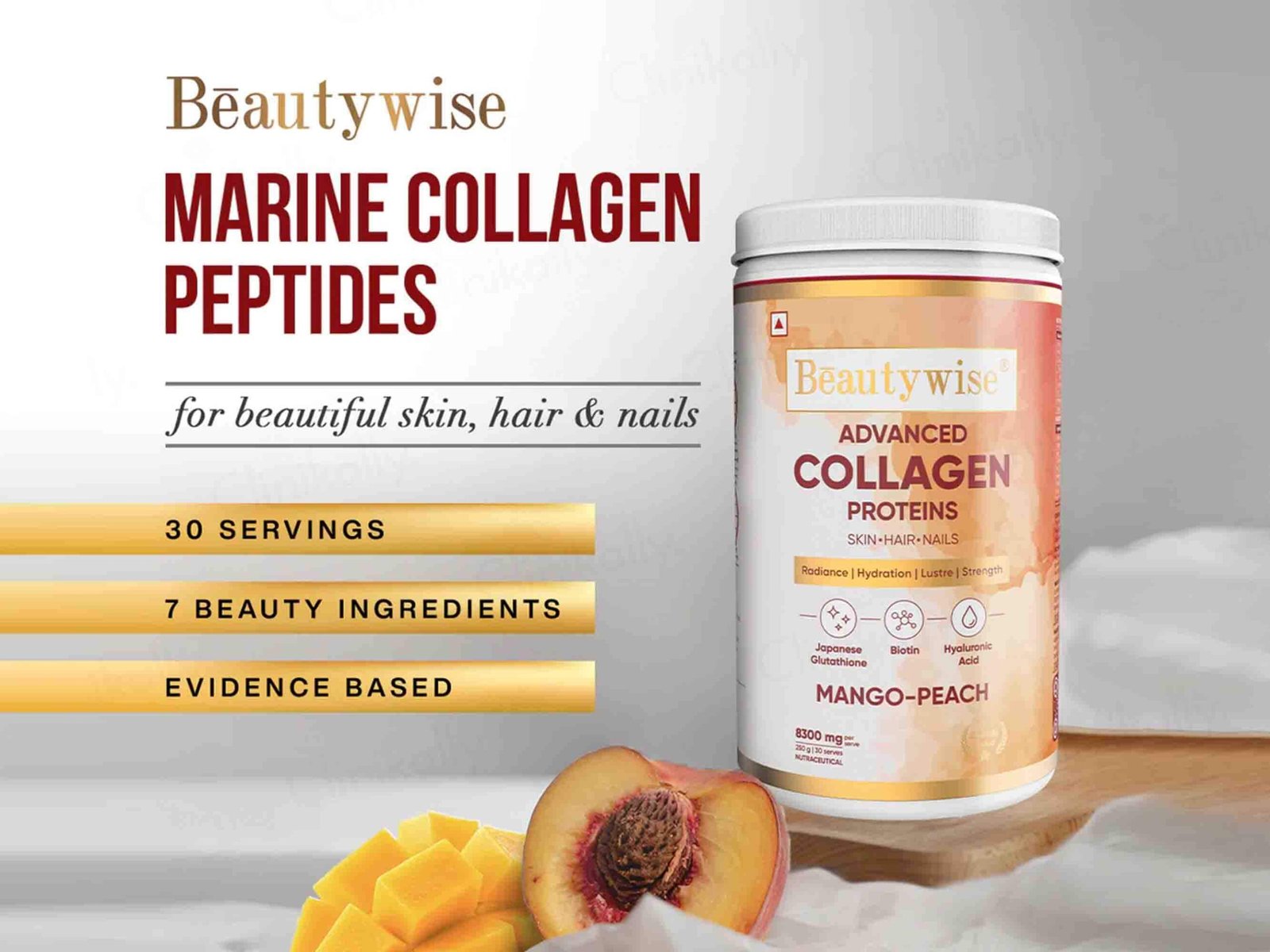 Beautywise Advanced Collagen Powder is a premium skin-rejuvenating formula made with hydrolyzed marine collagen peptides combined with powerful skin-enhancing ingredients like biotin, glutathione, hyaluronic acid, and vitamin C. It works synergistically to improve skin elasticity, reduce fine lines and wrinkles, and promote youthful radiance from within.